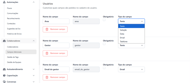 No menu lateral, na seção Colaboradores > Campos adicionais, você pode: