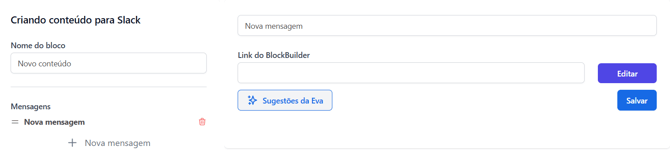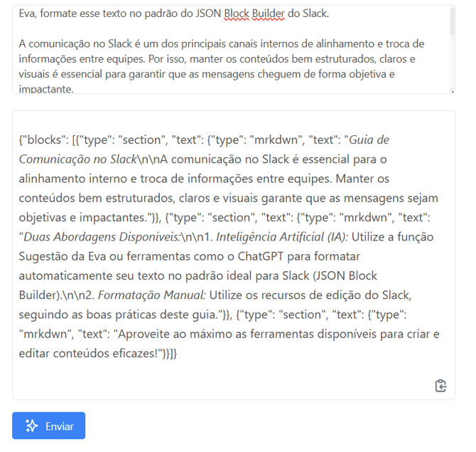- Usar a inteligência artificial (IA) – seja pela função Sugestão da Eva ou por ferramentas como o ChatGPT – que automaticamente formatam seu texto no padrão ideal para Slack (JSON Block Builder).