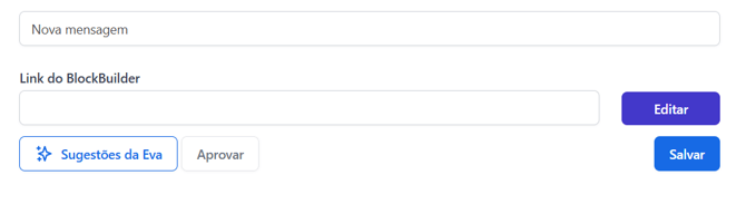 Para salvar um comunicado para uso futuro, copie a URL da página de edição e cole no campo “Link do BlockBuilder” na Eva. Isso garante que o conteúdo esteja acessível e reaproveitável por toda a equipe.