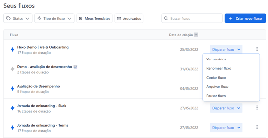 Na tela de Fluxos, clique nos três pontinhos que aparecem ao lado direito de cada fluxo. A partir desse menu, você pode: