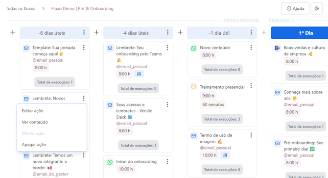 - Ver usuários: acompanhe quais colaboradores estão vinculados ao fluxo, o status de cada ação e em qual etapa cada um se encontra. Também é possível editar informações ou remover um colaborador do fluxo sem precisar excluir seu cadastro da plataforma.