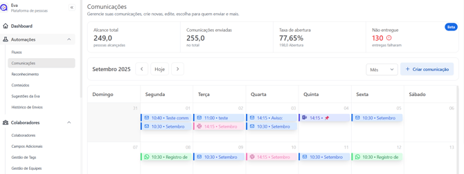 Descubra como usar o Menu de Comunicações da Eva para criar, agendar e gerenciar comunicações internas em múltiplos canais, com segmentação, calendário inteligente e métricas de desempenho."