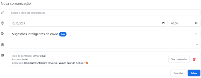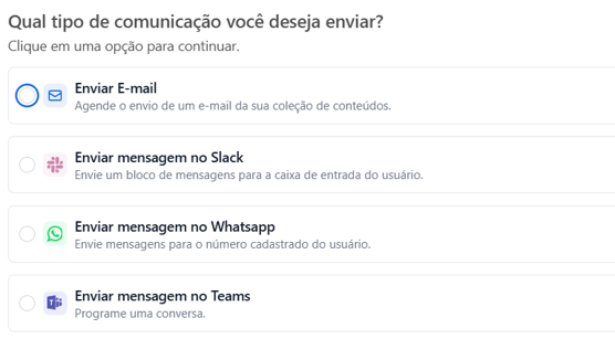 Você pode criar mensagens diretamente pelo calendário ou clicando em Criar Comunicação no topo da tela. O calendário suporta multi-canal, incluindo e-mail, WhatsApp, Teams e Slack, permitindo combinar canais conforme a necessidade da sua equipe.