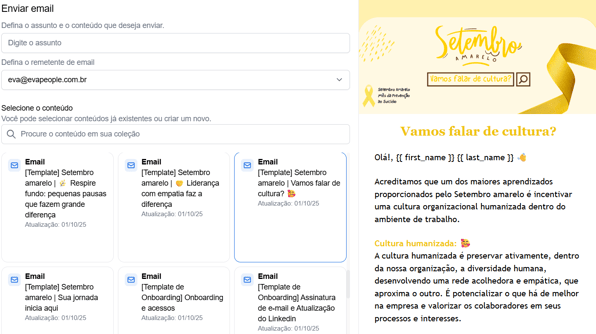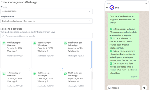 - Selecione o template inicial (mensagem prévia) e o conteúdo (mensagem principal).
