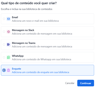 - Selecione Enquete como tipo de conteúdo e clique em Continuar.