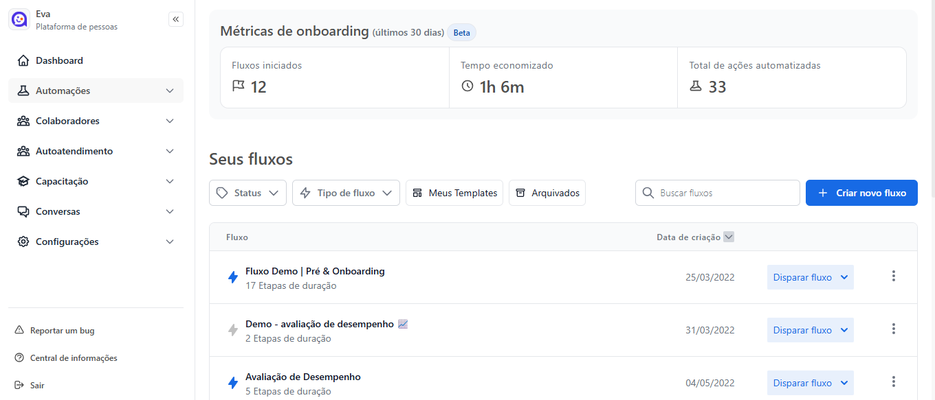 Automações: configure e acompanhe fluxos, comunicações, reconhecimento, conteúdos, sugestões da Eva e histórico de envios.