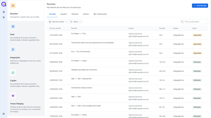 Navegue pela Eva e potencialize sua produtividade. Conheça o menu lateral para usuários, com acesso a Reuniões, Integrações, Copilot e Roleplay para tornar sua rotina mais eficiente.